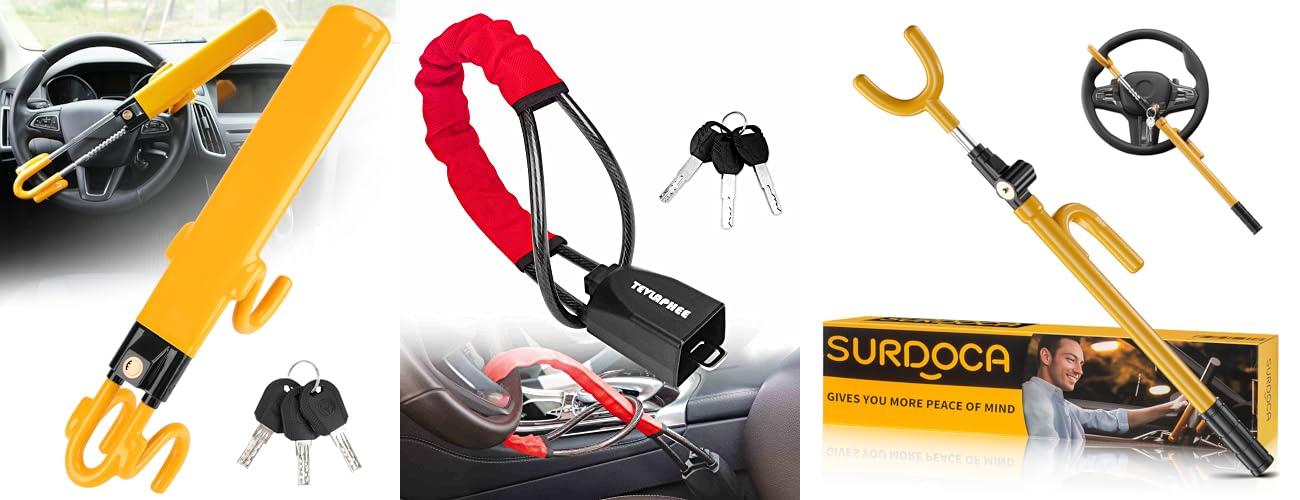 • Steering Wheel Locks: These are strong bars that lock your steering wheel. They make it very hard to turn the wheel, so the car can’t be driven.