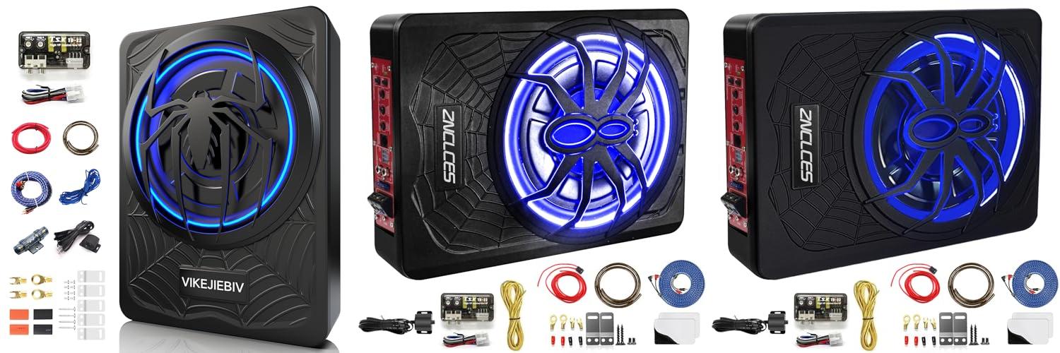 1. VIKEJIEBIV 1200W 10″ Slim Underseat Car Subwoofer and Amp Package with Ambient Light