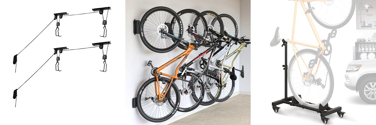 Cyclists who have expensive bikes might want storage that offers extra protection. A wall-mounted rack with padded hooks is a good choice. Some people even use ceiling hoists to keep their bikes perfectly stored.