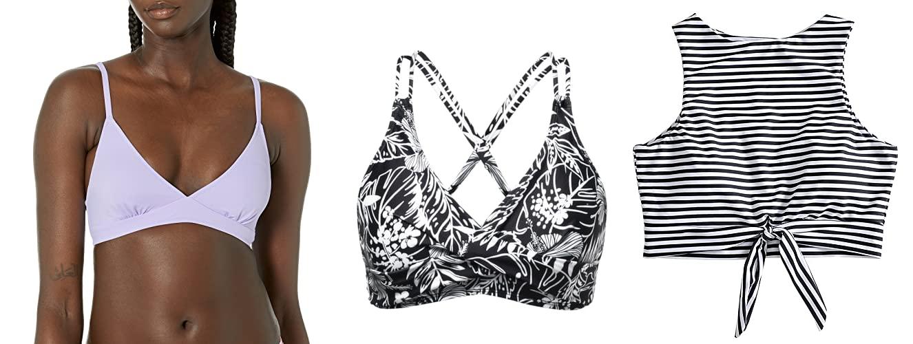 A: Styles with ruffles, padding, bold prints, or push-up features can create the illusion of a fuller bust. Bandeau and triangle tops are also great choices.