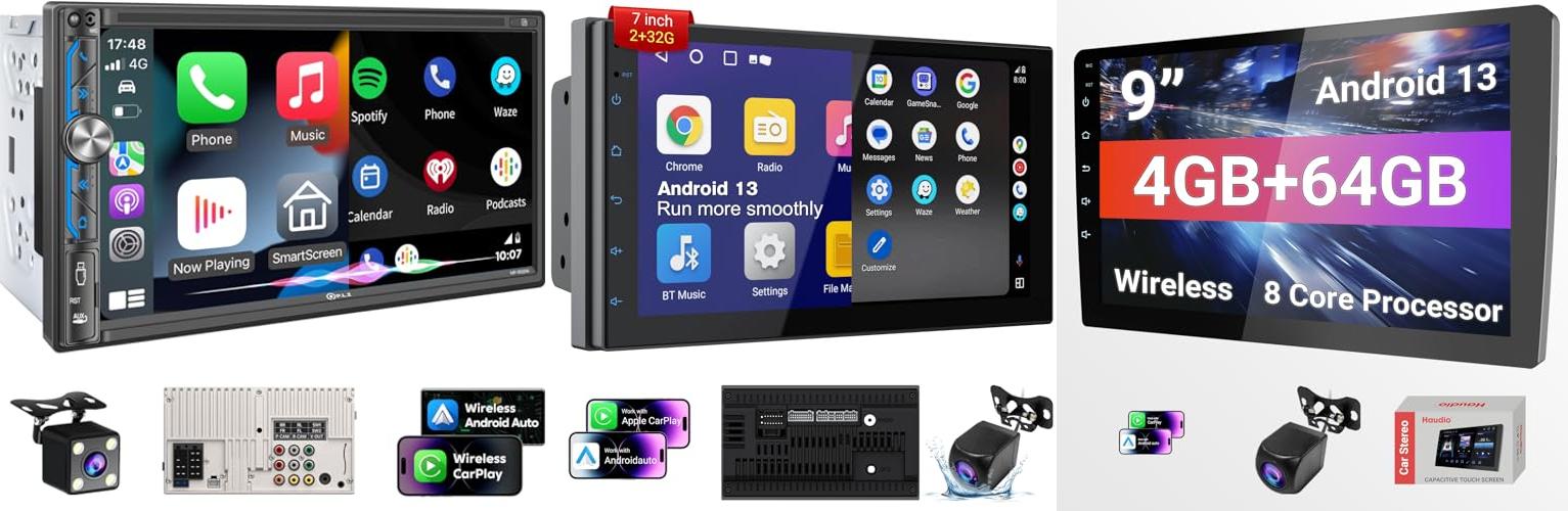 Upgrade your ride with the Haudio Wireless Double Din Car Stereo! This stereo has a 7″ HD touchscreen. It works with CarPlay and Android Auto wirelessly. You can easily connect your phone for maps, music, and calls. It also has a backup camera for safe reversing. This stereo fits most cars, trucks, and RVs. It’s packed with features to make your driving experience better.