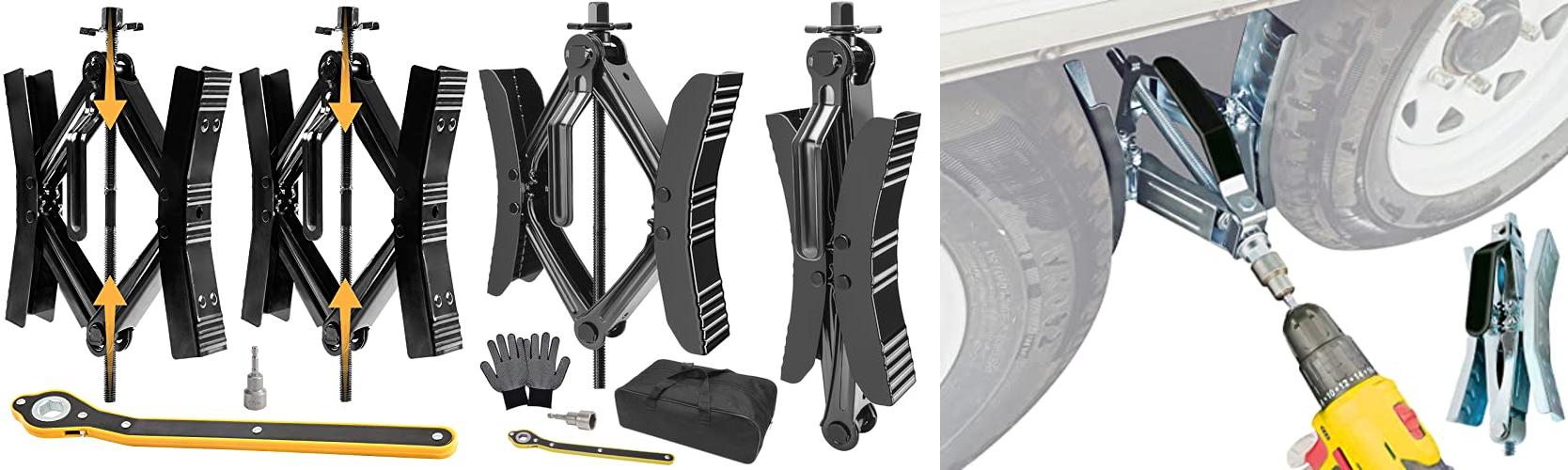 The Camper Wheel Chock Stabilizer is designed to keep your RV, trailer, or truck safe and steady. This kit includes two sets of heavy-duty wheel chocks that lock your tires in place. They are built to handle a wide range of vehicles, from travel trailers to big trucks. These chocks use a scissor locking system to prevent your wheels from moving. They also have an anti-rust coating, so they last longer. The chocks fit tires from 3.5 inches to 12 inches apart. This product comes with a crank handle and a socket adapter for easy use.