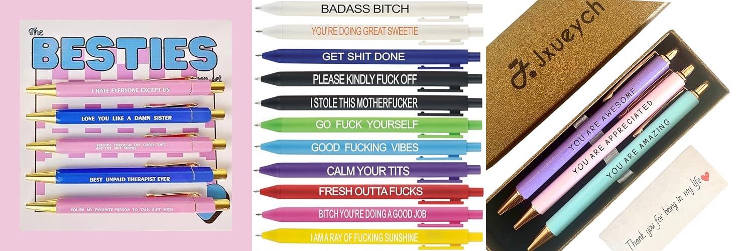 • The “funny” aspect of the pens isn’t strongly evident in the product description; they lean more towards inspirational.