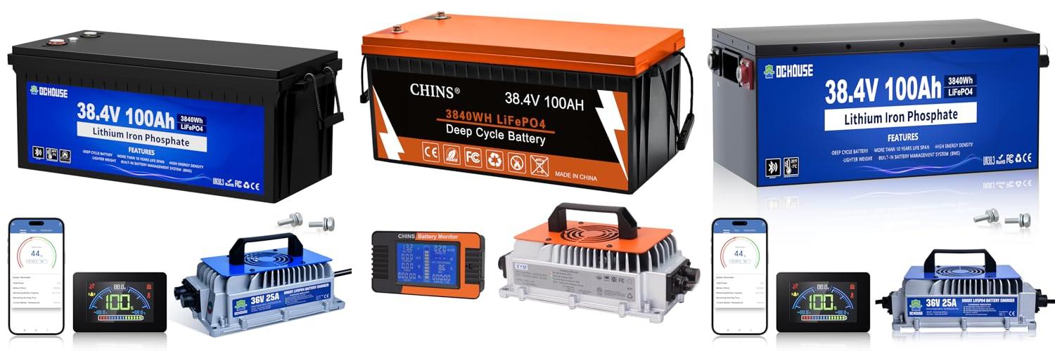 1. DC HOUSE Upgraded 36V 100Ah Lithium Golf Cart Battery Kit with 36V 25A Lithium Battery Charger