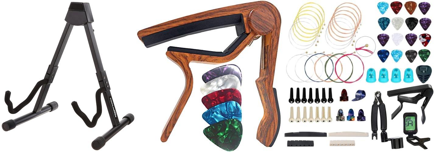 A: Beginners need picks, a strap, a tuner, and maybe a stand. These help you play, stay in tune, and keep your guitar safe.