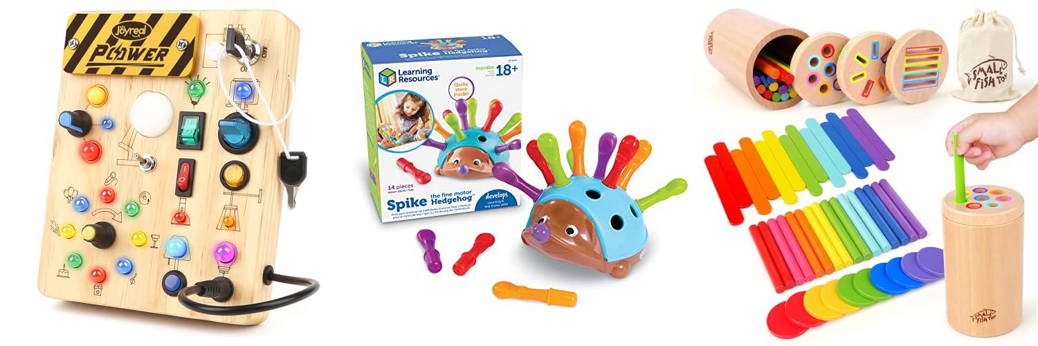 - Fine Motor Skills: Stacking cups, shape sorters, and threading beads help little hands get stronger.