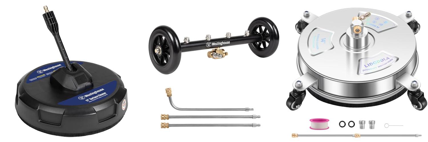 • Surface Cleaners: These round attachments are great for driveways, patios, and decks. They clean evenly and prevent those stripey marks you can get with a wand. They also reduce overspray, keeping you and your surroundings drier.