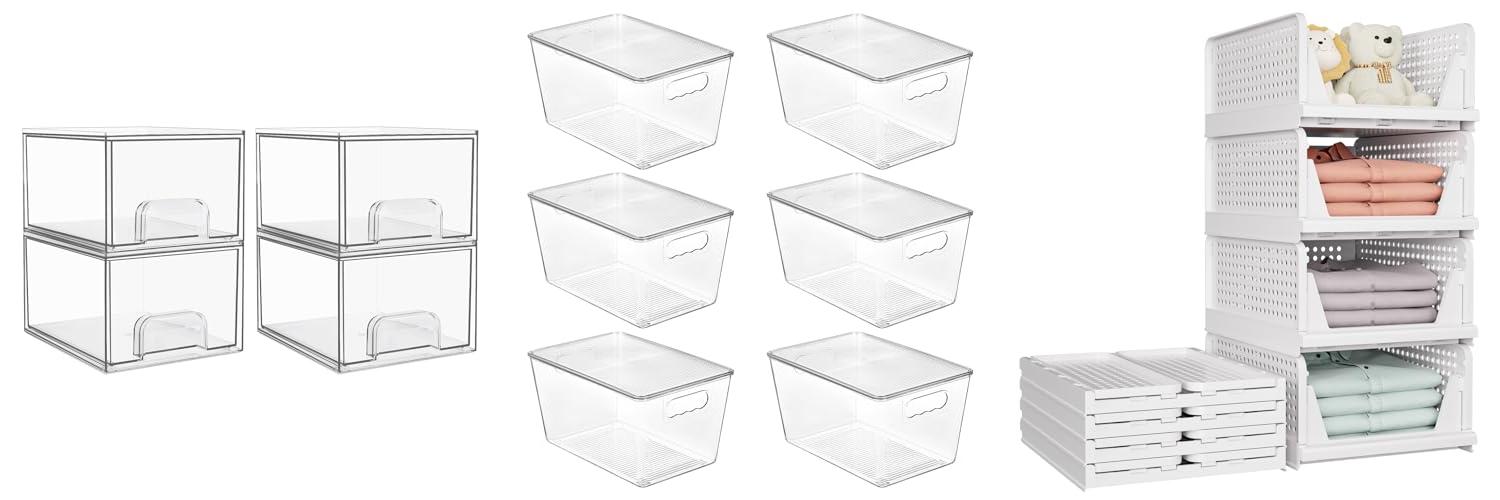 - Clear View and Stackable Design: The clear plastic lets you see what’s inside without pulling out the whole bin. You can stack them vertically with the lids to save space. They also stack neatly on top of each other when not in use, keeping your home tidy.