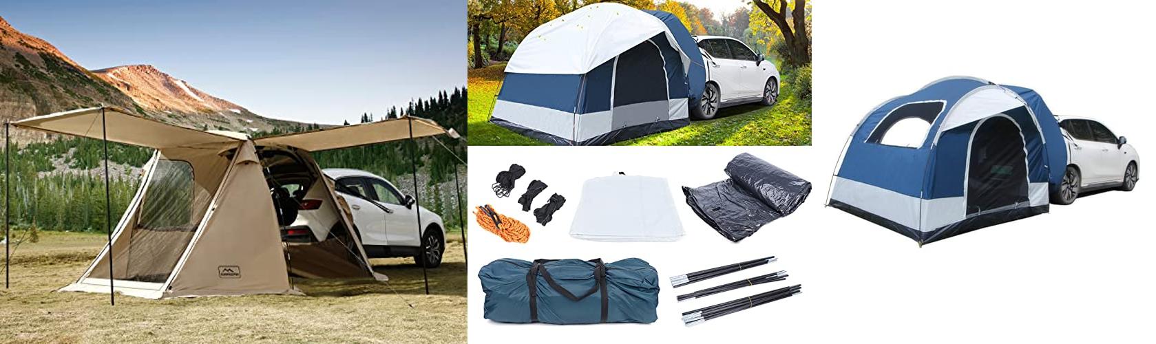 The SUV Tent for Camping is a versatile outdoor shelter. It is a 4-person foldable car camping tent. It works for camping and traveling. This tent has a waterproof double layer. It comes with ground nails and a handy storage bag. You can use it with many different types of vehicles.