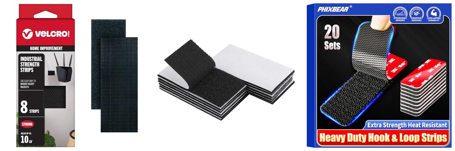 The PHIXBEAR 20 Sets Super Adhesive Hook and Loop Strips are heavy-duty fasteners. They are made with strong 3M VHB adhesive. These black strips are heat resistant and waterproof. You can use them inside or outside. They come in a set of 20 and are 1.2×3.2 inches each. They are great for many uses around your home, office, or garage.
